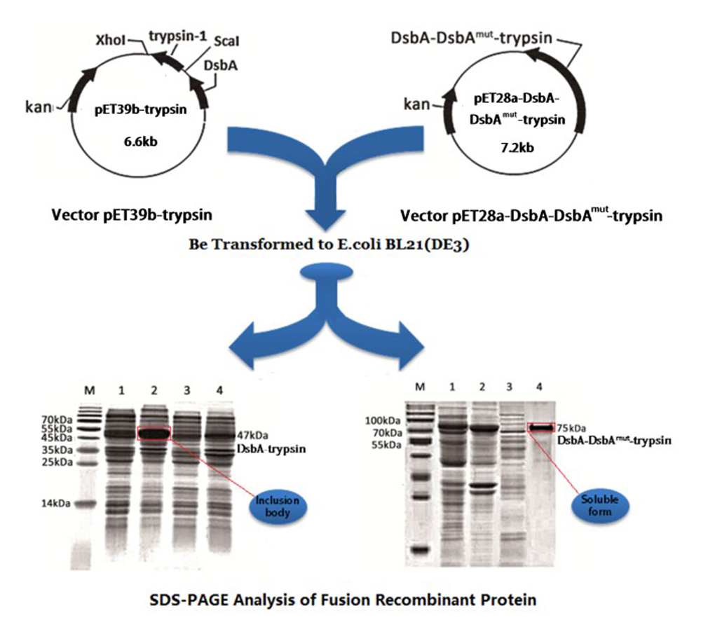 A co-expressing system of DsbA-DsbAmut was suggested for the first time to enhance the soluble expression of human trypsin-1. As a control, leaderless DsbA chaperone was also co-expressed with human trypsin-1. Vectors pET39b-trypsin and pET28a-DsbA-DsbAmut-trypsin with the above two DsbA fusion tag were constructed. The strain with vector pET39b-trypsin expressed fusion protein DsbA-trypsin in form of inclusion bodies. While in E. coli BL21 (DE3) strain with vector pET28a-DsbA-DsbAmut-trypsin, the soluble expression of trypsin fusion protein was achieved. Under the optimized expression conditions, the soluble fraction accounted for about 49.43% of total DsbA-DsbAmut-trypsin proteins in crude supernatant. The purification yield was 4.15% by nickel chelating chromatography and 3.3 mg activated trypsin with a purity of 88.68% was obtained from 1 L LB broth. To detect the possible functions of DsbA series chaperons in trypsin fusion protein, we analyzed the primary three-dimensional structure of fusion proteins, mainly focusing on the compatibleness between trypsin and fusion chaperons. The results suggested that (1) besides the primary function in periplasm, leaderless DsbA or DsbAmut may also act as a signal sequences-like leader targeted to periplasm that partly relieved the pressure from fusion protein overexpression and inclusion body formation, and (2) as there was significant soluble expression of DsbA-DsbAmut-trypsin compared with DsbA-trypsin, DsbAmut may function as charge or hydrophobic balance in recombinant protein DsbA-DsbAmut-trypsin.