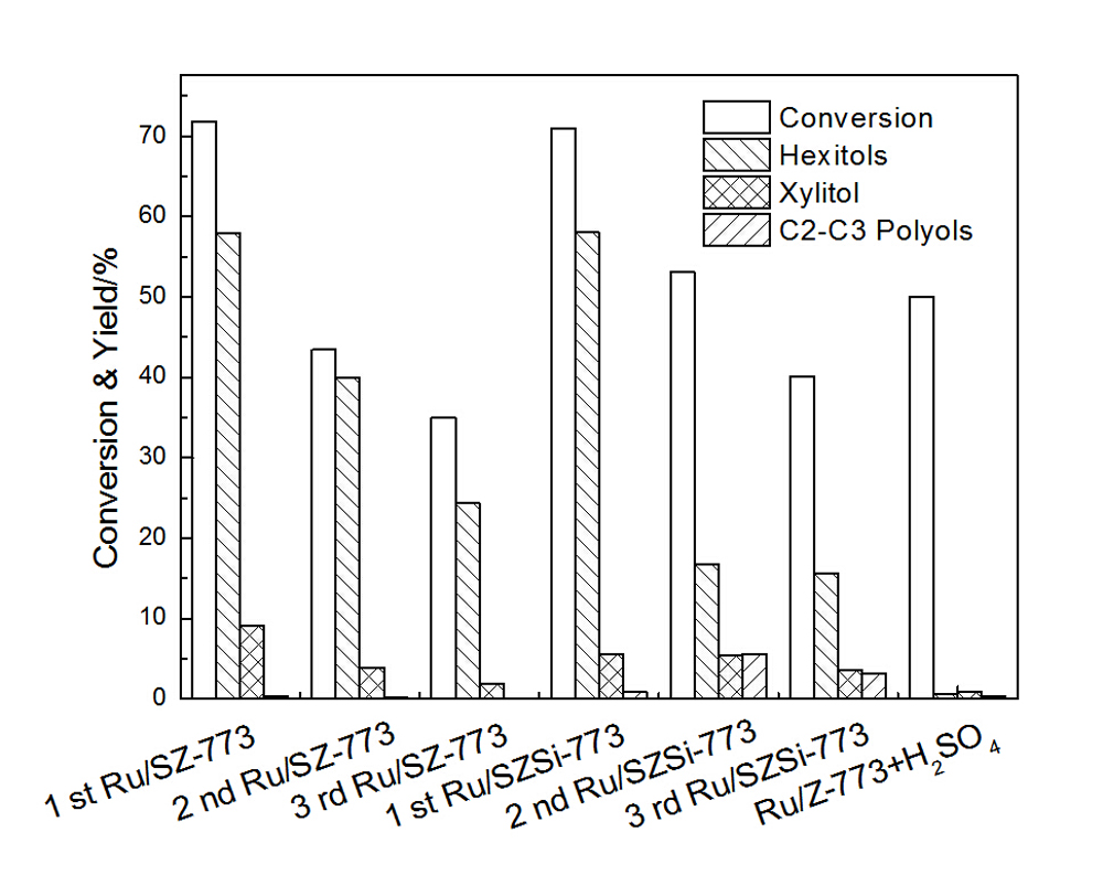We report a process of selective conversion of microcrystalline cellulose to hexitols over bi-functional Ru-supported sulfated zirconia and silica-zirconia catalysts. A 58.1% yield of hexitols and a 71.0% conversion of cellulose were achieved over Ru/SZSi(100:15)-773 catalyst at 443 K. The as-synthesized catalysts were characterized by X-ray diffraction (XRD), BET, thermogravimetric analysis and pyridine adsorption Fourier transform infrared spectroscopy (FTIR). XRD results indicated that the sulfated catalysts were pure tetragonal phase of ZrO2 when calcined at 773 K. Monoclinic zirconia appeared at the calcination temperature of 873 K, and the content of monoclinic phase increased with the elevating temperature. Compared with sulfated zirconia catalyst, sulfated silica-zirconia catalysts possessed a higher ratio of Brønsted to Lewis on the surface of catalysts, as shown from pyridine adsorption FTIR results. The reaction results indicated that the tetragonal zirconia, which is necessary for the formation of superacidity, was the active phase to cellulose conversion. The higher amounts of Brønsted acid sites can remarkably accelerate the cellulose depolymerization and promote side reactions that convert C5–C6 alcohols into the unknown soluble degradation products.