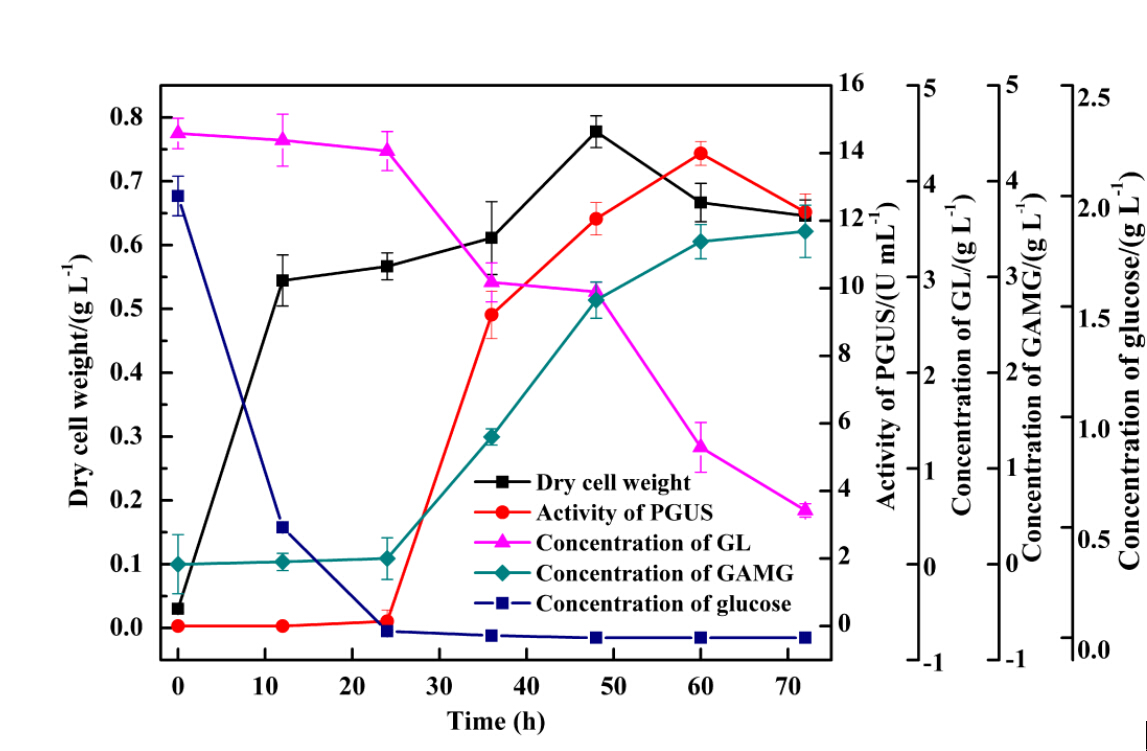 β-Glucuronidase from Penicillium purpurogenum Li-3 (PGUS) can efficiently hydrolyze glycyrrhizin into the more valuable glycyrrhetic acid monoglucuronide. However, a low productivity of PGUS and the lack of an effective separation strategy have significantly limited its industrial applications. Therefore, the production of PGUS has been improved by optimizing both the fermentation and purification strategies. A two-stage fermentation strategy was developed where PGUS was first grown with glucose and then PGUS was produced in the presence of glycyrrhizin as an inducer. By using this strategy, the biomass was increased 1.5 times and the PGUS activity increased 5.4 times compared to that when glycyrrhizin was used as the sole carbon source. The amount of PGUS produced was increased another 16.6% when the fermentation was expanded to a 15-L fermenter. An effective protocol was also established to purify the PGUS using a sequential combination of hydrophobic, strong anion-exchange and gel filtration chromatography. This protocol had a recovery yield of 6% and gave PGUS that was 39 times purer than the crude PGUS. The purified PGUS had a specific activity of 350 U·mg−1.