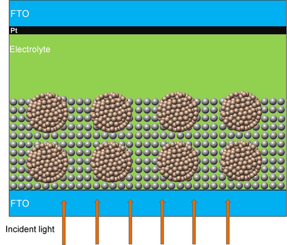 This study presents a novel nanostructural electrode made of 20-nm-diameter nanoparticles, which orderly decorated with 2-µm TiO2 particles, deposited by a new gel process. The decorated electrode (DE) is better than the non-decorated electrode (NE) in both light scattering and light harvesting, as confirmed by diffuse reflectance spectroscopy. X-ray diffraction reveals that both electrodes have a mixture of anatase and rutile phases. The dye-sensitized solar cell based on the decorated electrode shows the highest power conversion efficiency of 7.80% as a result of less recombination demonstrated by electrochemical impedance spectroscopy. From internal power conversion efficiency measurement, the external quantum efficiency of DE cell at 530 nm is 89%, which is higher than that of NE cell (77%).