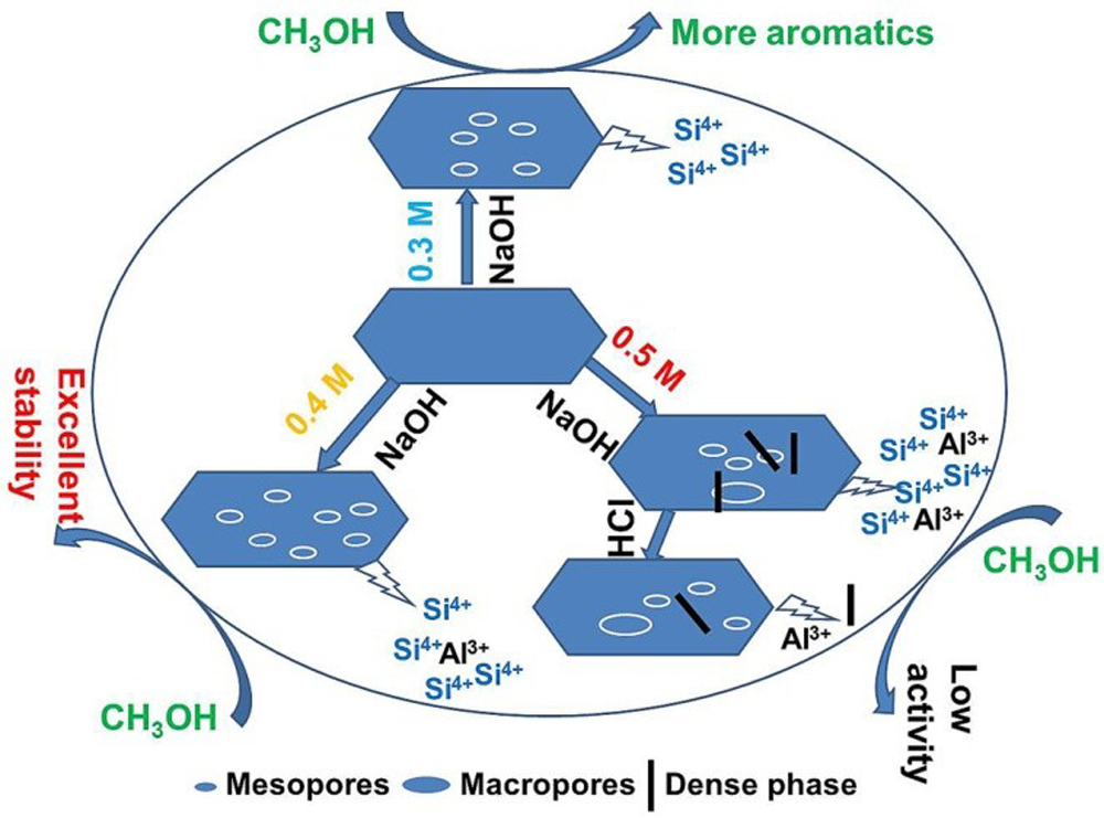 The effects of alkaline treatment on the physical properties of ZSM-5 catalysts and on their activities for methanol to aromatics conversion have been investigated. A mild alkaline treatment (0.2 and 0.3 mol/L NaOH) created mesopores in the parent zeolite with no obvious effect on acidity. The presence of mesopores gives the catalyst a longer lifetime and higher selectivity for aromatics. Treatment with 0.4 mol/L NaOH decreased the number of Brønsted acid sites due to dealumination and desilication, which resulted in a lower deactivation rate. In addition, more mesopores were produced than with the mild alkaline treatment. As a result, the lifetime of the sample treated with 0.4 mol/L NaOH was almost five times that of the parent ZSM-5. Treatment with a higher alkaline concentration (0.5 mol/L) greatly reduced the number of Brønsted acid sites and the number of micropores resulting in incomplete methanol conversion. When the alkaline-treated catalysts were washed with acid, some of the porosity was restored and a slight increase in selectivity for aromatics was obtained.