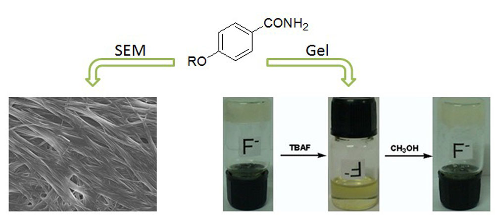 A series of p-alkoxylbenzamides featuring a long alkyl chain have been synthesized and are readily to form stable gels in a variety of organic solvents. Their self-assembly properties and structure-property relationship were investigated by scanning electron microscopy, X-ray diffraction, 1H nuclear magnetic resonance, and Fourier transform infrared spectroscopy. The gels formed were multi-responsive to environmental stimuli such as temperature and fluoride anion. The results show that a combination of hydrogen bonding, π-π stacking and van der Waals interaction result in the aggregation of p-alkoxylbenzamides to form three-dimension networks, depending on the length of the long alkyl chain.