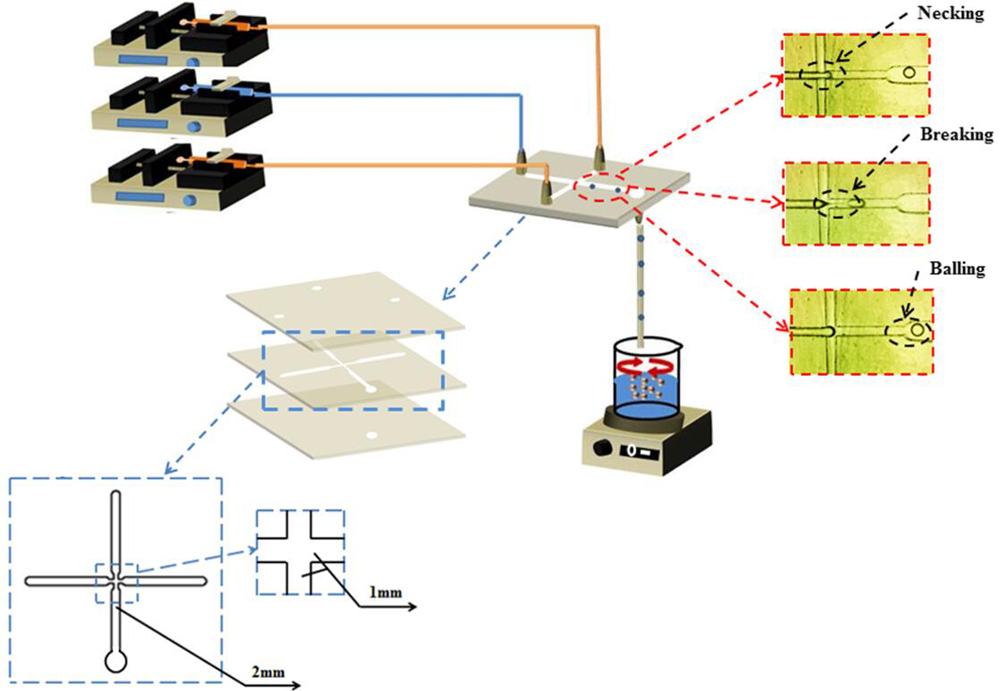 The novelty of this article is focusing on the synthesis method of microfluidic technology. Microfluidic technology occupies high position in product control for the controllable size, structure, component and morphology. The key part of microfluidic equipment is the chip. The continuous phase was pumped into microfluidic chip to sheer dispersed phase at the cross aisle. Dispersed phase necked first under extrusion and shear force, and then it drew and broke into a spherical mic