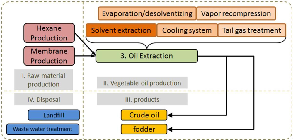 Solvent extraction of crude oil from oilseeds is widely applied for its high production capacity and low cost. In this process, solvent recovery and tail gas treatment are usually performed by adsorption, paraffin scrubbing, or even cryogenics (at low tail gas flow rates). Membrane separation, which has a lower energy consumption than these techniques, spans a broad range of admissible concentrations and flow rates, and is moreover easily combined with other techniques. Vapor recompression has potentials to reduce the heat loss in association with distillation and evaporation. In this study, we proved the possibility of combining membrane separation and vapor recompression to improve the conventional vegetable oil production, by both experiments and process simulation. Nearly 73% of energy can be saved in the process of vegetable oil extraction by the novel processing approach. By further environmental assessment, several impact categories show that the optimized process is environmentally sustainable.