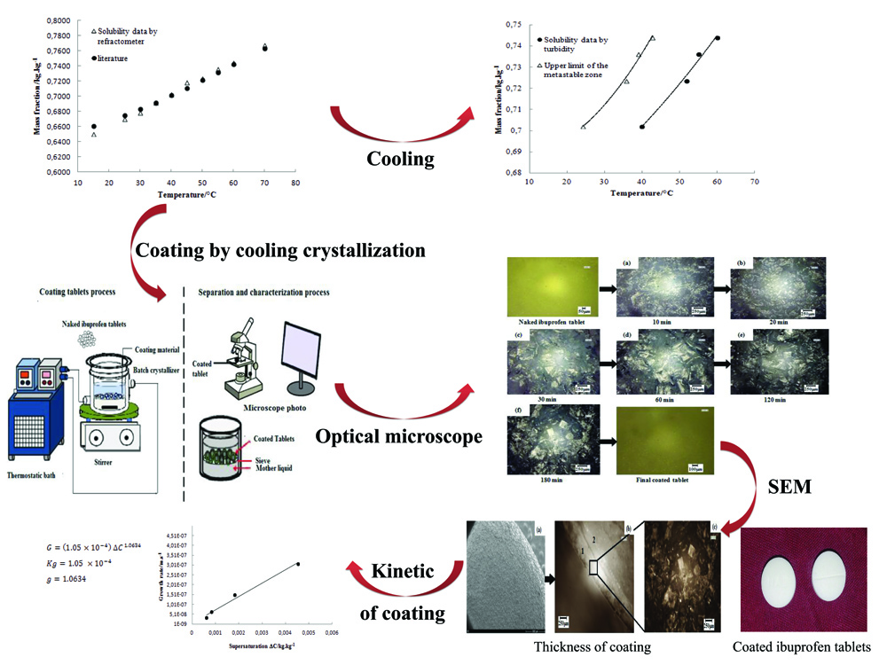 Sugar spray coating is a frequently used process in the pharmaceutical industry. However, this process presents the disadvantage to form an amorphous coating around the active ingredient. A crystalline coating formed on the surface of a tablet is highly desirable. Recently, a new process of coating by cooling crystallization has been developed and applied on bisacodyl pastilles obtained by melt crystallization. In this work, we investigated the feasibility of coating by cooling crystallization on ibuprofen “naked tablets” manufactured by compression. In the first part of this work, the solubility and the metastable zone width have been determined experimentally for the coating solution because they are essential factors for any crystallization process. In the second part, the coating process is investigated on the operating conditions that affect the surface morphology and the crystal growth rate. These experimental conditions include concentration of the coating solution, degree of sub-cooling, agitation speed, retention time, and surface properties of the naked ibuprofen tablets. The results show that naked tablet coating by cooling crystallization is feasible and can be applied in the pharmaceutical industry.