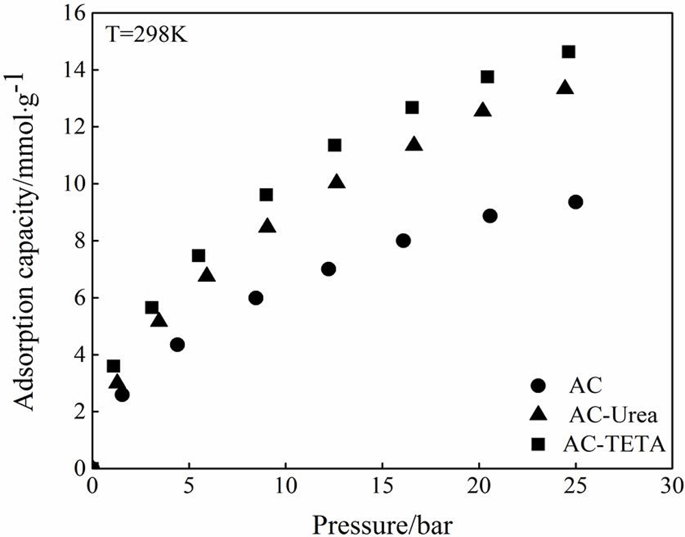 A new type of activated carbon (AC) was synthesized using broom sorghum stalk as a low cost carbon source through chemical activation with H3PO4 and KOH. The AC obtained by KOH had the largest BET surface area of 1619 m2·g−1 and the highest micropore volume of 0.671 cm3·g−1. CO2 adsorption was enhanced by functionalizing the AC with two different amines: triethylenetetramine (TETA) and urea. The structure of the prepared ACs was characterized by Brunauer-Emmett-Teller method, scanning electron microscopy, Fourier transform infrared spectroscopy, thermogravimetric analysis and acid-base Boehm titration analyses. The adsorption behavior of CO2 onto raw and amine-functionalized ACs was investigated in the temperature range of 288–308 K and pressures up to 25 bar. The amount of CO2 uptake at 298 K and 1 bar achieved by AC-TETA and AC-urea was 3.22 and 2.33 mmol·g−1which shows a 92% and 40% improvement compared to pristine AC (1.66 mmol·g−1), respectively. Among different model isotherms used to describe the adsorption equilibria, Sips isotherm presented a perfect fit in all cases. Gas adsorption kinetic study revealed a fast kinetics of CO2adsorption onto the ACs. The evaluation of the isosteric heat of adsorption demonstrated the exothermic nature of the CO2 adsorption onto unmodified and modified samples.