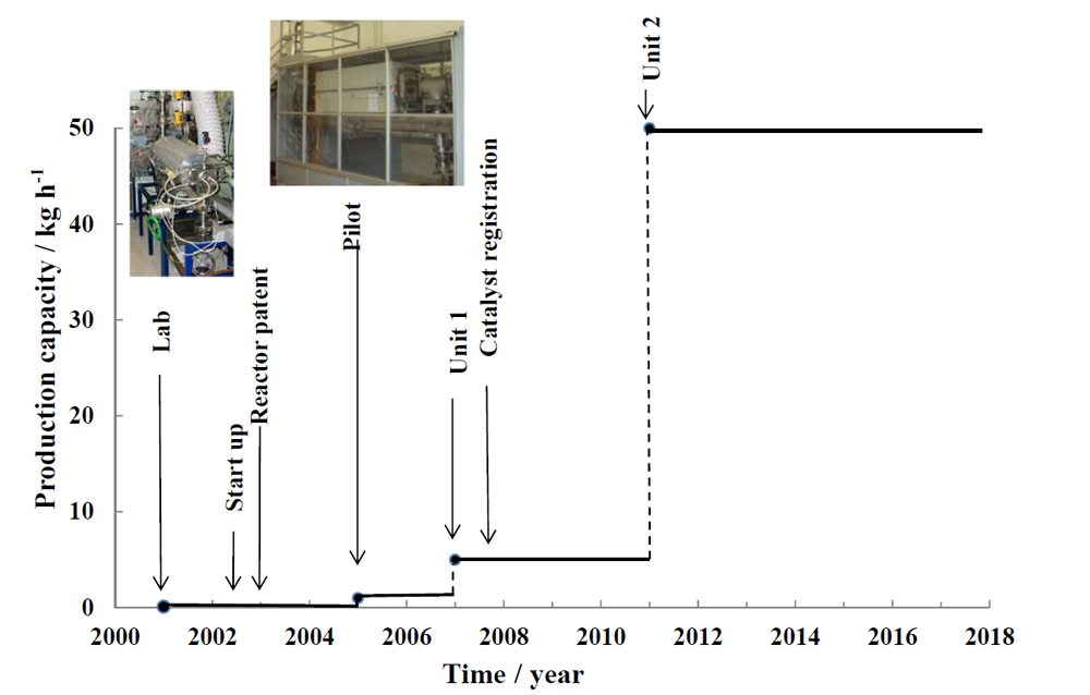This article reports the different steps of the design, development and validation of a process for continuous production of carbon nanotubes (CNTs) via catalytic chemical vapor deposition from the laboratory scale to the industrial production. This process is based on a continuous inclined mobile-bed rotating reactor and very active catalysts using methane or ethylene as carbon source. The importance of modeling taking into account the hydrodynamic, physicochemical and physical phenomena that occur during CNT production in the process analysis is emphasized. The impact of this invention on the environment and human health is taken into consideration too.