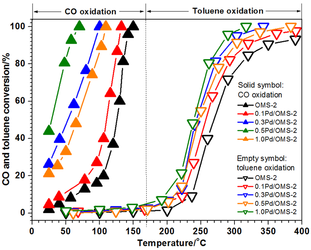 The Pd catalyst supported on cryptomelane-type manganese oxide octahedral molecular sieve (OMS-2) were prepared. The effect of Pd loading on the catalytic oxidation of carbon monoxide, toluene, and ethyl acetate over xPd/OMS-2 has been investigated. The results show that the Pd loading plays an important role on the physicochemical properties of the xPd/OMS-2 catalysts which outperform the Pd-free counterpart with the 0.5Pd/OMS-2 catalyst being the best. The temperature for 50% conversion was 25, 240 and 160 °C, and the temperature for 90% conversion was 55, 285 and 200 °C for oxidation of CO, toluene, and ethyl acetate, respectively. The low-temperature reducibility and high oxygen mobility of xPd/OMS-2 are the factors contributable to the excellent catalytic performance of 0.5Pd/OMS-2.