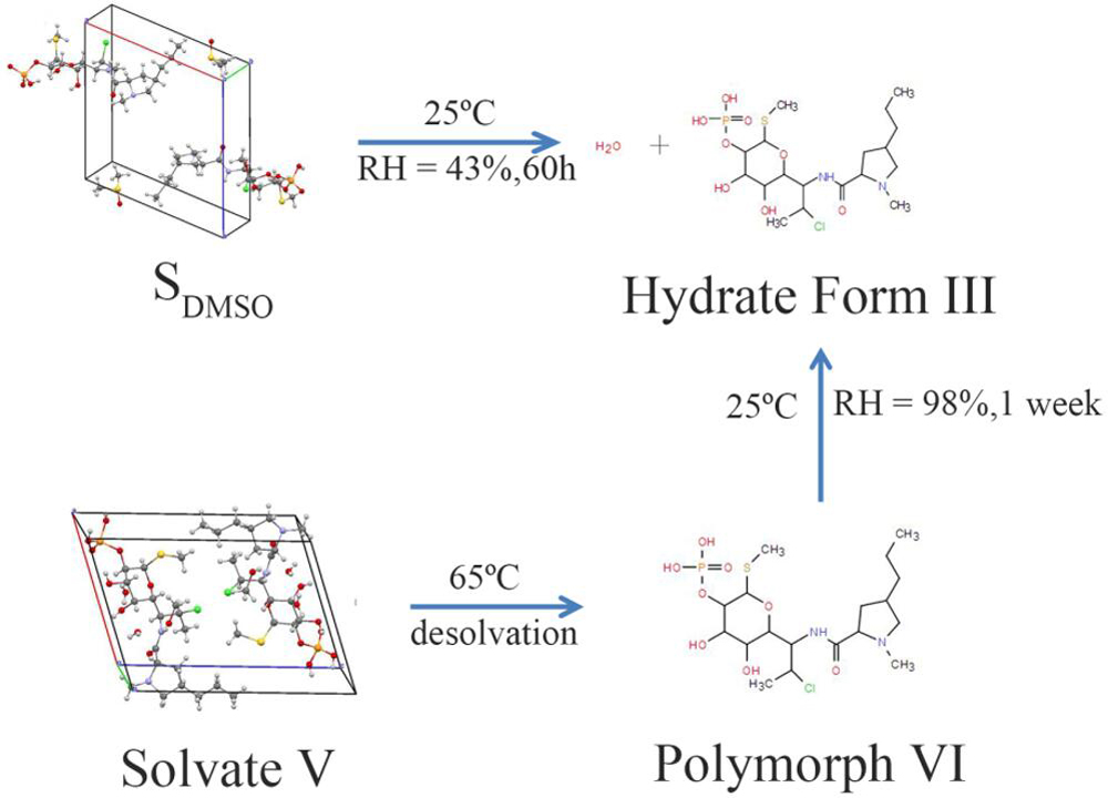 Clindamycin phosphate (CP), an antibacterial agent, has been reported to form several solid-state forms. The crystal structures of two CP solvates, a dimethyl sulfoxide (DMSO) solvate and a methanol/water solvate (solvate V), have been determined by single crystal X-ray diffraction. The properties and transformations of these forms were characterized by powder X-ray diffraction, Single-crystal X-ray diffraction, differential scanning calorimetry, thermo gravimetric analysis, hot-stage microscopy, and dynamic vapor sorption. Very different hydrogen bonding networks exist among the host-host and host-solvent molecules in the two crystal structures, resulting in different moisture stabilities. The thermal stabilities of the two solvates upon heating and desolvation were also studied. When the temperature was above the boiling point of methanol, solvate V converted to a polymorphic phase after a one step desolvation process, whereas the desolvation temperature of the DMSO solvate was below the boiling point of DMSO. At the relative humidity above 43%, the DMSO solvate transformed to a hydrate at 25 °C. In contrast, solvate V did not transform at any of the humidities studied.