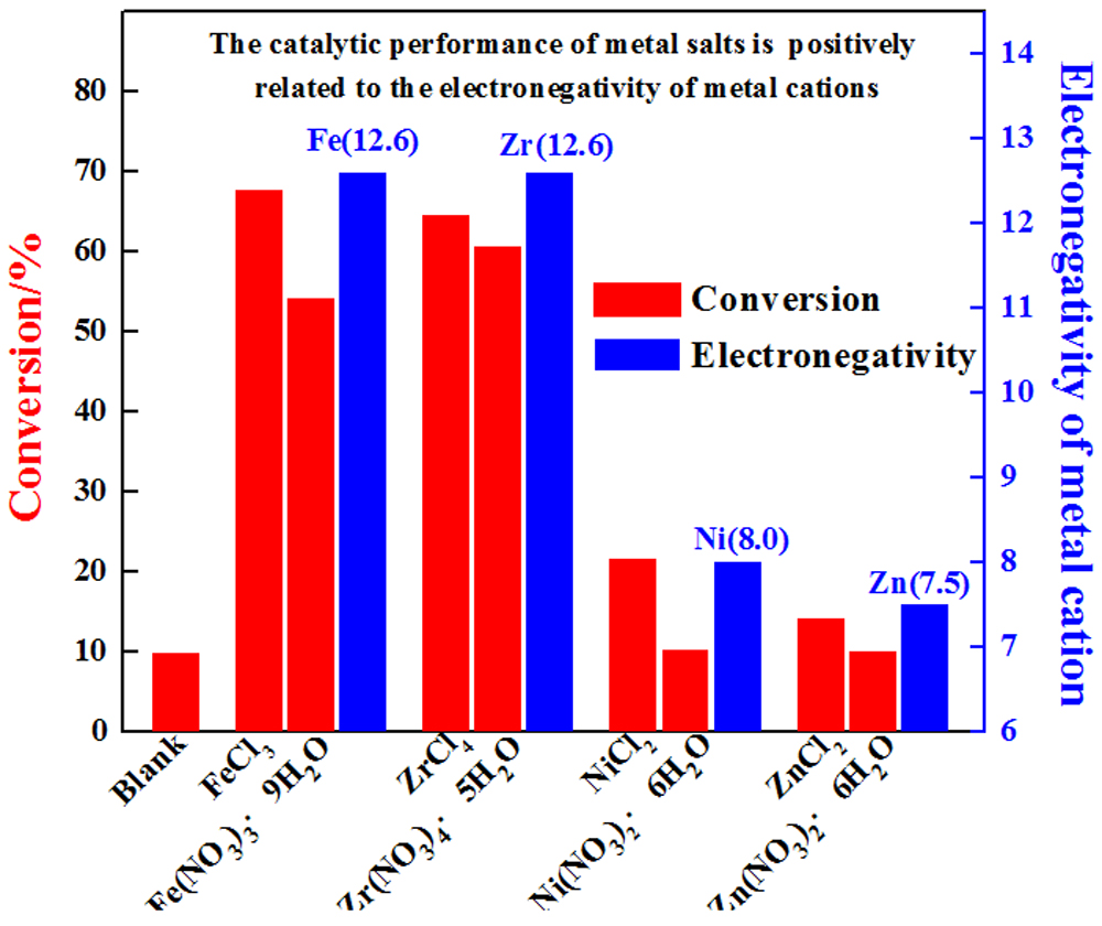 Metal salts with highly electronegative cations have been used to effectively catalyze the liquid-phase nitration of benzene by NO2 to nitrobenzene under solvent-free conditions. Several salts including FeCl3, ZrCl4, AlCl3, CuCl2, NiCl2, ZnCl2, MnCl2, Fe(NO3)3·9H2O, Bi(NO3)3·5H2O, Zr(NO3)4·5H2O, Cu(NO3)2·6H2O, Ni(NO3)2·6H2O, Zn(NO3)2·6H2O, Fe2(SO4)3, and CuSO4 were examined and anhydrous FeCl3 exhibited the best catalytic performance under the optimal reaction conditions. The benzene conversion and selectivity to nitrobenzene were both over 99%. In addition, it was determined that the metal counterion and the presence of water hydrates in the salt affects the catalytic activity. This method is simple and efficient and may have potential industrial application prospects.