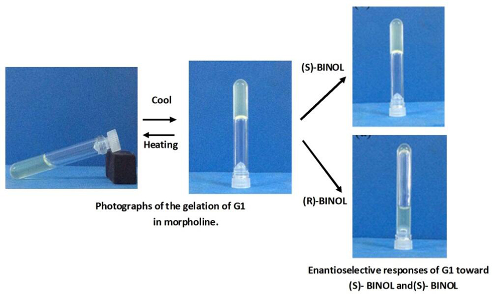 A novel gelator that contained both Schiff base and L-lysine moieties was synthesized and its gelation behavior was tested. This gelator can form gels in various organic solvents. The resulting gel can be applied as a fascinating platform for visual recognition of enantiomeric 1-(2-hydroxynaphthalen-1-yl)naphthalen-2-ol (BINOL) through selective gel collapse. In addition, the mechanism for the reaction of the gel with chiral BINOL was investigated by scanning electron microscope and 1H nuclear magnetic resonance.