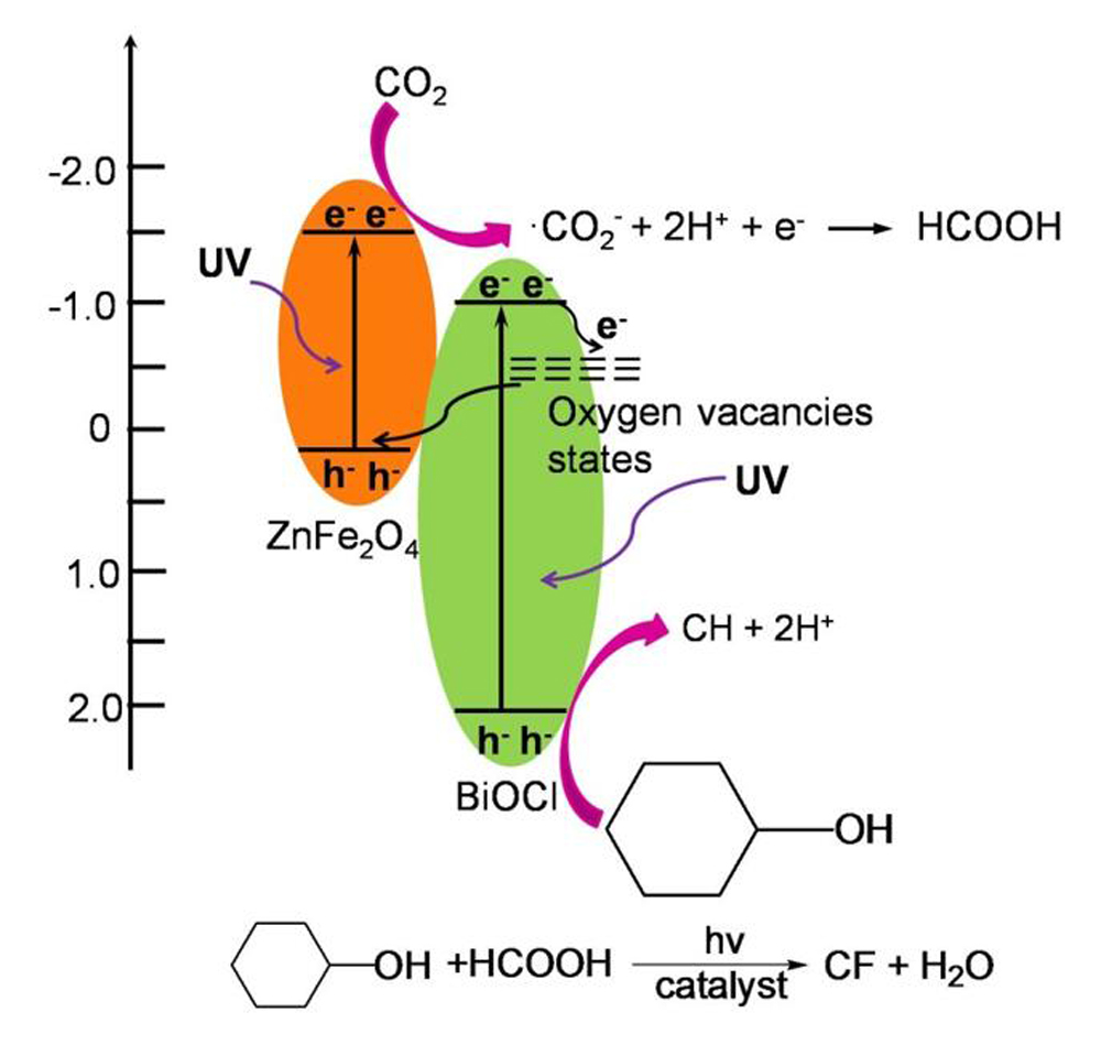 ZnFe2O4-BiOCl composites were prepared by both hydrothermal and direct precipitation processes and the structures and properties of the samples were characterized by various instrumental techniques. The samples were then used as catalysts for the photocatalytic reduction of CO2 in cyclohexanol under ultraviolet irradiation to give cyclohexanone (CH) and cyclohexyl formate (CF). The photocatalytic CO2 reduction activities over the hydrothermally prepared ZnFe2O4-BiOCl composites were higher than those over the directly-precipitated composites. This is because compared to the direct-precipitation sample, the ZnFe2O4 nanoparticles in the hydrothermal sample were smaller and more uniformly distributed on the surface of BiOCl and so more heterojunctions were formed. Higher CF and CH yields were obtained for the pure BiOCl and BiOCl composite samples with more exposed (001) facets than for the samples with more exposed (010) facets. This is due to the higher density of oxygen atoms in the exposed (001) facets, which creates more oxygen vacancies, and thereby improves the separation efficiency of the electron-hole pairs. More importantly, irradiation of the (001) facets with ultraviolet light produces photo-generated electrons which is helpful for the reduction of CO2 to ·CO2–. The mechanism for the photocatalytic reduction of CO2 in cyclohexanol over ZnFe2O4-BiOCl composites with exposed (001) facets involves electron transfer and carbon radical formation.