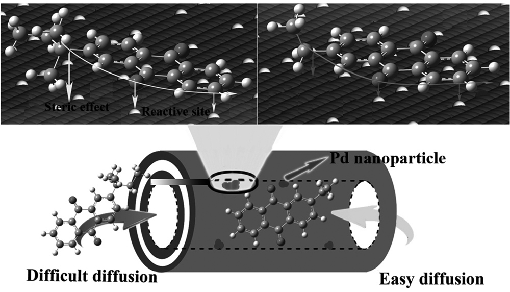 The hydrogenation of 2-ethylanthraquinone (eAQ), 2-tert-amylanthraquinone (taAQ) and their mixtures with molar ratios of 1:1 and 1:2 to the corresponding hydroquinones (eAQH2 and taAQH2) were studied over a Pd/Al2O3 catalyst in a semi-batch slurry reactor at 60 °C and at 0.3 MPa. Compared to eAQ, TaAQ exhibited a significantly slower hydrogenation rate (about half) but had a higher maximum yield of H2O2 and a smaller amount of degradation products. This can be ascribed to the longer and branched side chain in taAQ, which limits its accessibility to the Pd surface and its diffusion through the pores of the catalyst. Density functional theory calculations showed that it is more difficult for taAQ to adsorb onto a Pd (111) surface than for eAQ. The hydrogenation of the eAQ/taAQ mixtures had the slowest rates, lowest H2O2yields and the highest amounts of degradation products.
