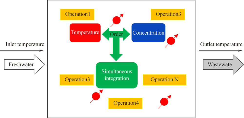 A new conceptual methodology is proposed to simultaneously integrate water allocation and energy networks with non-isothermal mixing. This method employs a simultaneous model and includes two design steps. In the first step, the water allocation network (WAN), which could achieve the targets of saving water and energy, is obtained by taking account the temperature factor into the design procedure. The optimized targets of both freshwater and energy are reached at this step which ensures this approach is a simultaneous one. In the second step, based on the obtained WAN, the whole water allocation and heat exchange network (WAHEN) is combined with the non-isothermal mixing to reduce the number of heat exchangers. The thus obtained WAHEN can achieve three optimization targets (minimization of water, energy and the number of heat exchangers). Furthermore, the effectivity of our method has been demonstrated by solving two literature examples.