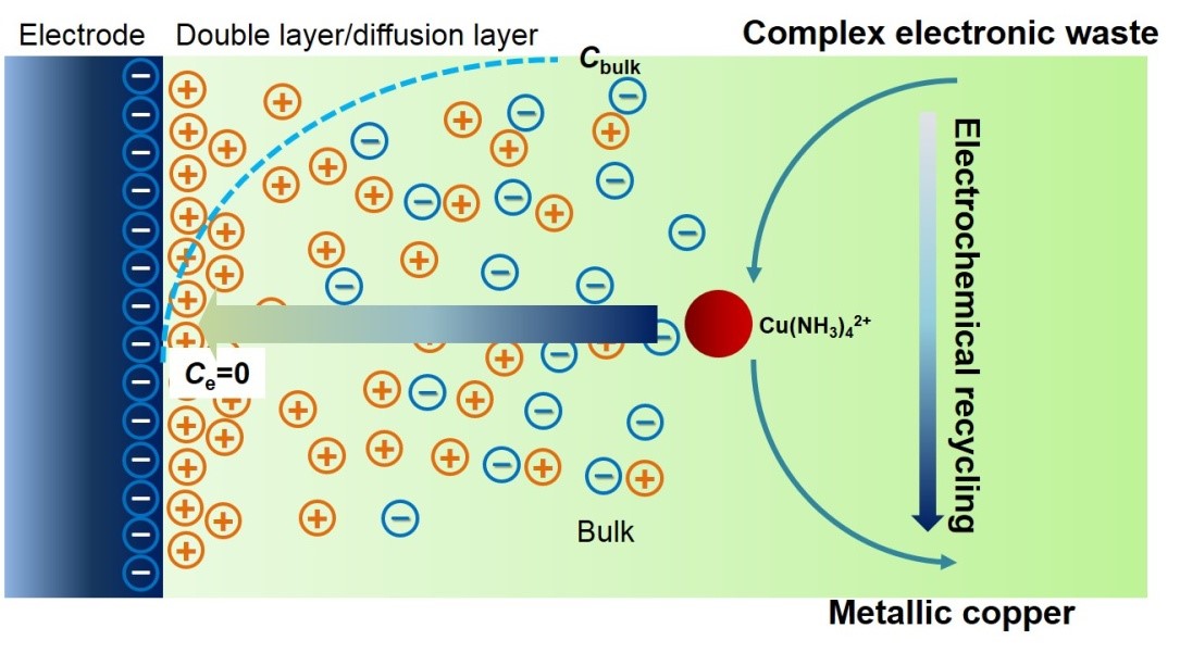 Leaching selectivity during metal recovery from complex electronic waste using a hydrochemical process is always one of the generic issues. It was recently improved by using ammonia-based leaching process, specifically for electronic waste enriched with copper. This research proposes electrodeposition as the subsequent approach to effectively recover copper from the solutions after selective leaching of the electronic waste and focuses on recognising the electrochemical features of copper recovery. The electrochemical reactions were investigated by considering the effects of copper concentration, scan rate and ammonium salts. The diffusion coefficient, charge transfer coefficient and heterogeneous reaction constant of the electrodeposition process were evaluated in accordance with different solution conditions. The results have shown that electrochemical recovery of copper from ammonia-based solution under the conditions of selective electronic waste treatment is charge transfer controlled and provide bases to correlate the kinetic parameters with further optimisation of the selective recovery of metals from electronic waste.