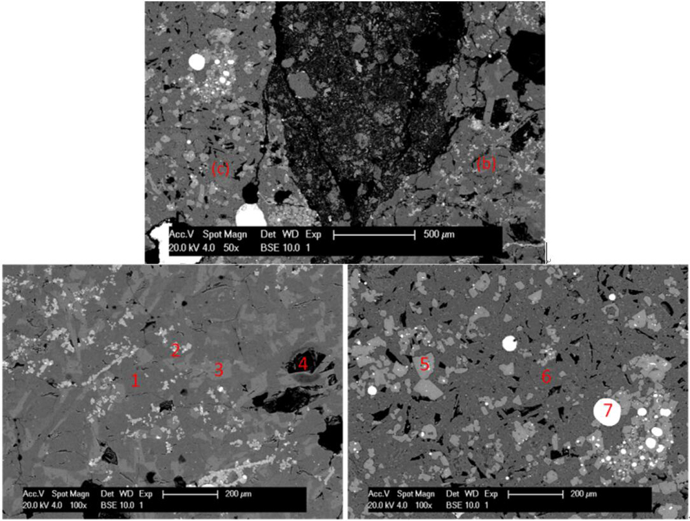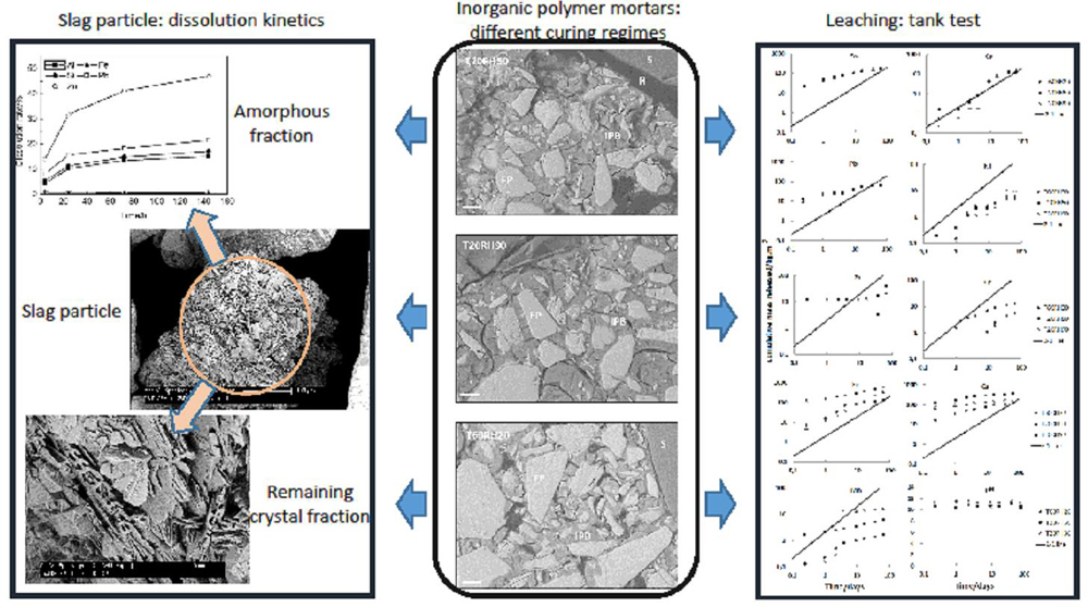 This study reports on the impact of the curing conditions on the mechanical properties and leaching of inorganic polymer (IP) mortars made from a water quenched fayalitic slag. Three similar IP mortars were produced by mixing together slag, aggregate and activating solution, and cured in three different environments for 28 d: a) at 20 °C and relative humidity (RH) ~ 50% (T20RH50), b) at 20 °C and RH≥90% (T20RH90) and c) at 60 °C and RH ~ 20% (T60RH20). Compressive strength (EN 196-1) varied between 19 MPa (T20RH50) and 31 MPa (T20RH90). This was found to be attributed to the cracks formed upon curing. Geochemical modelling and two leaching tests were performed, the EA NEN 7375 tank test, and the BS EN 12457-1 single batch test. Results show that Cu, Ni, Pb, Zn and As leaching occurred even at high pH, which varied between 10 and 11 in the tank test’s leachates and between 12 and 12.5 in the single batch’s leachates. Leaching values obtained were below the requirements for non-shaped materials of Flemish legislation for As, Cu and Ni in the single batch test.