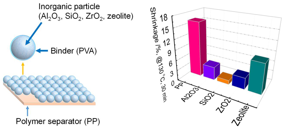 Coating commercial porous polyolefin separators with inorganic materials can improve the thermal stability of the polyolefin separators and hence improve the safety of lithium-ion batteries. Several different inorganic materials have been studied for the coating. However, there lacks a study on how different inorganic materials affect the properties of separators, in terms of thermal stability and cell performance. Herein, we present such a study on coating a commercial polypropylene separator with four inorganic materials, i.e., Al2O3, SiO2, ZrO2 and zeolite. All inorganic coatings have improved thermal stability of the separators although with differences. The coating layers add 28%–45% of electrical resistance compared with the pure polypropylene separator, but all the cells prepared with the coated polypropylene separators have the same electrical chemical performance as the uncoated separator in terms of rate capability and capacities at different temperatures.