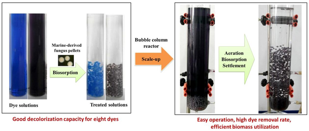 To increase the efficiency of dye removal from wastewater using mycelial pellets, a bubble column reactor with a simple structure was designed and efficiently used to remove dyes from solution containing dyes. The mycelial pellets were prepared by marine fungus Aspergillus niger ZJUBE-1. Eight dyes were tested as dye targets for the adsorption capacity of mycelial pellets and good removal results were obtained. Eriochrome black T was selected as a model dye for characterizing the adsorption processes in detail. The measurement results of Zeta potential and FT-IR analysis indicate that the electrostatic attraction may play a key role in the biosorption process. The bubble column reactor was utilized to study the batch dye-removal efficiency of mycelial pellets. A re-culture process between every two batches, which was under non-sterile condition, successfully enhanced the utilization of mycelium biomass. The dye removal rate is 96.4% after 12 h in the first batch and then decreases slowly in the following batches. This semi-continuous mode, which consists of commutative processes of dye-removal and re-culture, has some outstanding advantages, such as low power consumption, easy operation, high dye removal rate, and efficient biomass utilization.