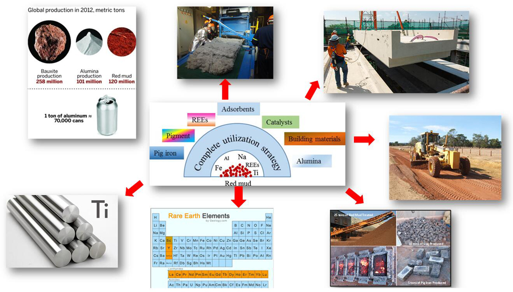 Bayer’s process revolutionized the extraction of aluminum from the bauxite ores. However, the hydrothermal extraction of alumina is associated with the generation of a byproduct, red-mud consisting of undissolved solids composed of iron oxides, sodium alumino silicates, titania, silica and rare earth elements. The accumulation of red-mud (or bauxite residue) in the world is 30 billion metric tons produced at a rate of 125 million tons per annum (2013). Utilization of red-mud for constructional purposes, wastewater treatment, metallurgical products, and pigments are listed. Metallurgical processing efforts of red-mud to generate various value added products such as pig iron, direct reduced iron slag wool, magnetite, titania, iron carbides are presented in the article.