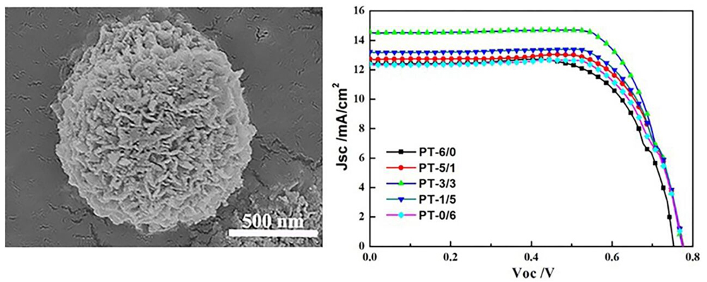 Three-dimensional TiO2 microspheres doped with N were synthesized by a simple single-step solvothermal method and the sample treated for 15 h (hereafter called TMF) was then used as scattering layers in the photoanodes of dye-sensitized solar cells (DSSCs). The TMF was characterized using scanning electron microscopy, high resolution transmission electron microscopy, Brunauer-Emmett-Teller measurements, X-ray diffraction, and X-ray photoelectron spectroscopy. The TMF had a high surface area of 93.2 m2·g−1 which was beneficial for more dye-loading. Five photoanode films with different internal structures were fabricated by printing different numbers of TMF scattering layers on fluorine-doped tin oxide glass. UV-vis diffuse reflection spectra, incident photon-to-current efficiencies, photocurrent-voltage curves and electrochemical impedance spectroscopy were used to investigate the optical and electrochemical properties of these photoanodes in DSSCs. The presence of nitrogen in the TMF changed the TMF microstructure, which led to a higher open circuit voltage and a longer electron lifetime. In addition, the presence of the nitrogen significantly improved the light utilization and photocurrent. The highest photoelectric conversion efficiency achieved was 8.08%, which is much higher than that derived from typical P25 nanoparticles (6.52%).