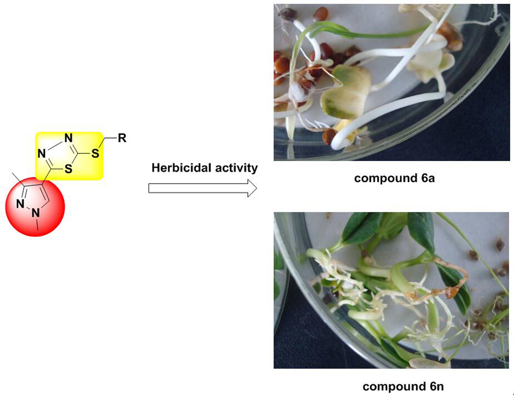 A variety of pyrazole derivatives containing 1,3,4-thiadiazole moiety were synthesized under microwave irradiation, and their structures were confirmed by 1H NMR and HRMS. They were evaluated for herbicidal and antifungal activities, and the results indicated that two compounds with a phenyl group (6a) and 4-tert-butylphenyl group (6n) possess good herbicidal activity for dicotyledon Brassica campestris and Raphanus sativus with the inhibition of 90% for root and 80%–90% for stalk at 100 ppm respectively. The structure-activity relationship of compounds 6a and 6n was also studied by density function theory method.