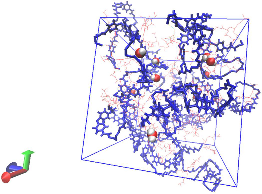 Isothermal-isobaric molecular dynamics simulation was used to study the diffusion mechanism of water in polyurethane-block-poly(N-isopropyl acrylamide) (PU-block-PNIPAm) with a hydrophobic PU/hydrophilic PNIPAm mass ratio of 1.4 to 1 at 298 K and 450 K. Here, the experimental glass transition temperature (Tg) of PU is 243 K while that of PNIPAm is 383 K. Different amounts of water up to 15 wt-% were added to PU-block-PNIPAm. We were able to reproduce the specific volumes and glass transition temperatures (250 K and 390 K) of PU-block-PNIPAm. The computed self-diffusion coefficient of water increased exponentially with increasing water concentration at both temperatures (i.e., following the free volume model of Fujita). It suggested that water diffusion in PU-block-PNIPAm depends only on its fractional free volume despite the free volume inhomogeneity. It is noted that at 298 K, PU is rubbery while PNIPAm is glassy. Regardless of temperature, radial distribution functions showed that water formed clusters with sizes in the range of 0.2–0.4 nm in PU-block-PNIPAm. At low water concentrations, more clusters were found in the PU domain but at high water concentrations, more in the PNIPAm domain. It is believed that water molecules diffuse as clusters rather than as individual molecules.