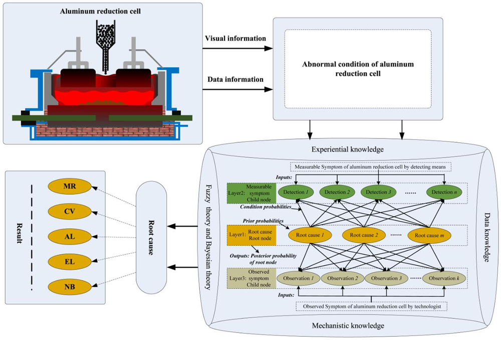 Root cause analysis (RCA) of abnormal aluminum electrolysis cell condition has long been a challenging industrial issue due to its inherent complexity in analyzing based on multi-source knowledge. In addition, accurate RCA of abnormal aluminum electrolysis cell condition is the precondition of improving current efficiency. RCA of abnormal condition is a complex work of multi-source knowledge fusion, which is difficult to ensure the RCA accuracy of abnormal cell condition because of dwindling and frequent flow of experienced technicians. In view of this, a method based on Fuzzy-Bayesian network to construct multi-source knowledge solidification reasoning model is proposed. The method can effectively fuse and solidify the knowledge, which is used to analyze the cause of abnormal condition by technicians providing a clear and intuitive framework to this complex task, and also achieve the result of root cause automatically. The proposed method was verified under 20 sets of abnormal cell conditions, and implements root cause analysis by finding the abnormal state of root node, which has a maximum posterior probability by Bayesian diagnosis reasoning. The accuracy of the test results is up to 95%, which shows that the knowledge reasoning feasibility for RCA of aluminum electrolysis cell.