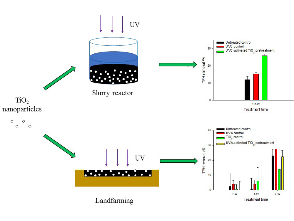 Heavy hydrocarbons (HHCs) in soils impacted by crude oil spills are generally recalcitrant to biodegradation due to their low bioavailability and complex chemical structure. In this study, soils were pretreated with varying concentrations of ultraviolet radiation A (UVA) or ultraviolet radiation C (UVC) activated titanium dioxide (TiO2) (1%–5%) under varying moisture conditions (0%–300% water holding capacity (WHC)) to enhance biodegradation of HCCs and shorten remediation timeframes. We demonstrate that pretreatment of impacted soils with UVC-activated TiO2 in soil slurries could enhance bioremediation of HHCs. Total petroleum hydrocarbon (TPH) removal after 24 h exposure to UVC (254 nm and 4.8 mW/cm2) was (19.1±1.6)% in slurries with 300% WHC and 5 wt-% TiO2. TPH removal was non-selective in the C15-C36 range and increased with moisture content and TiO2 concentration. In a 10-d bioremediation test, TPH removal in treated soil increased to (26.0±0.9)%, compared to (15.4±0.8)% for controls without photocatalytic pre-treatment. Enhanced biodegradation was also confirmed by respirometry. This suggests that addition of UVC-activated TiO2 to soil slurries can transform recalcitrant hydrocarbons into more bioavailable and biodegradable byproducts and increase the rate of subsequent biodegradation. However, similar results were not observed for soils pretreated with UVA activated TiO2. This suggests that activation of TiO2 by sunlight and direct addition of TiO2 to unsaturated soils within landfarming setting may not be a feasible approach. Nevertheless, less than 1% of UVA (7.5 mW/cm2) or UVC (1.4 mW/cm2) penetrated beyond 0.3 cm soil depth, indicating that limited light penetration through soil would hinder the ability of TiO2 to enhance soil bioremediation under land farming conditions.