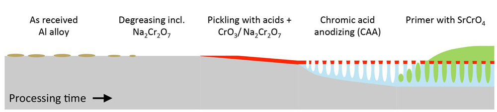 For more than six decades, chromic acid anodizing (CAA) has been the central process in the surface pre-treatment of aluminum for adhesively bonded aircraft structures. Unfortunately, this electrolyte contains hexavalent chromium (Cr(VI)), a compound known for its toxicity and carcinogenic properties. To comply with the new strict international regulations, the Cr(VI)-era will soon have to come to an end. Anodizing aluminum in acid electrolytes produces a self-ordered porous oxide layer. Although different acids can be used to create this type of structure, the excellent adhesion and corrosion resistance that is currently achieved by the complete Cr(VI)-based process is not easily matched. This paper provides a critical overview and appraisal of proposed alternatives to CAA, including combinations of multiple anodizing steps, pre- and post anodizing treatments. The work is presented in terms of the modifications to the oxide properties, such as morphological features (e.g., pore size, barrier layer thickness) and surface chemistry, in order to evaluate the link between fundamental principles of adhesion and bond performance.