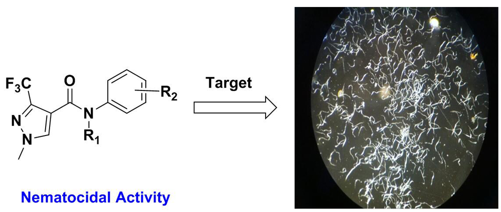 Pyrazole carboxamide derivatives represent an important class of fungicides in agrochemicals. To find more novel structural pyrazole carboxamides, a novel series of 3-(trifluoromethyl)-1H-pyrazole-4-carboxamide compounds were prepared from ethyl 4,4,4-trifluoroacetoacetate and triethyl orthoformate as starting materials. All the products were characterized by Fourier transform infrared spectroscopy, 1H nuclear magnetic resonance (NMR), 13C NMR, 19F NMR and mass spectrography. The bioassay results showed these fluorine-containing pyrazole carboxamides have a weak fungicidal activity but some of them exhibit a good nematocidal activity against M. incognita.