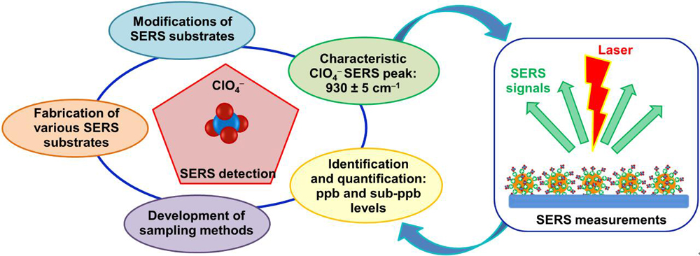 Perchlorate has recently emerged as a widespread environmental contaminant of healthy concern. Development of novel detection methods for perchlorate with the potential for field use has been an urgent need. The investigation has shown that surface-enhanced Raman scattering (SERS) technique has great potential to become a practical analysis tool for the rapid screening and routine monitoring of perchlorate in the field, particularly when coupled with portable/handheld Raman spectrometers. In this review article, we summarize progress made in SERS analysis of perchlorate in water and other media with an emphasis on the development of SERS substrates for perchlorate detection. The potential of this technique for fast screening and field testing of perchlorate-contaminated environmental samples is discussed. The challenges and possible solutions are also addressed, aiming to provide a better understanding on the development directions in the research field.