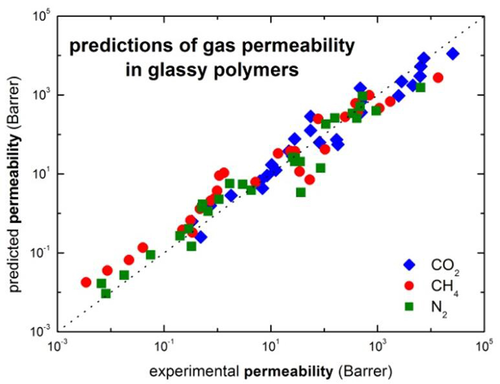 The possibility to evaluate in a predictive way the relevant transport properties of low molecular weight species, both gases and vapors, in glassy polymeric membranes is inspected in detail, with particular attention to the methods recently developed based on solid thermodynamic basis. The solubility of pure and mixed gases, diffusivity and permeability of single gases in polymer glasses are examined, considering in particular poly(2,6-dimethyl-1,4-phenylene oxide) as a relevant test case. The procedure clearly indicates what are the relevant physical properties of the polymer matrix and of the penetrants required by the calculations, which can be obtained experimentally through independent measurements. For gas and vapor solubility, the comparison with direct experimental data for mixed gases points out also the ability to account for the significant variations that solubility-selectivity experiences upon variations of pressure and/or feed composition. For gas and vapor permeability, the comparison with direct experimental data shows the possibility to account for the various different trends observed experimentally as penetrant pressure is increased, including the so-called plasticization behavior. The procedure followed for permeability calculations leads also to clear correlations between permeability and physical properties of both polymer and penetrant, based on which pure predictive calculations are reliably made.