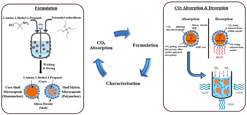 Carbon capture is widely recognised as an essential strategy to meet global goals for climate protection. Although various CO2 capture technologies including absorption, adsorption and membrane exist, they are not yet mature for post-combustion power plants mainly due to high energy penalty. Hence researchers are concentrating on developing non-aqueous solvents like ionic liquids, CO2-binding organic liquids, nanoparticle hybrid materials and microencapsulated sorbents to minimize the energy consumption for carbon capture. This research aims to develop a novel and efficient approach by encapsulating sorbents to capture CO2 in a cold environment. The conventional emulsion technique was selected for the microcapsule formulation by using 2-amino-2-methyl-1-propanol (AMP) as the core sorbent and silicon dioxide as the shell. This paper reports the findings on the formulated microcapsules including key formulation parameters, microstructure, size distribution and thermal cycling stability. Furthermore, the effects of microcapsule quality and absorption temperature on the CO2 loading capacity of the microcapsules were investigated using a self-developed pressure decay method. The preliminary results have shown that the AMP microcapsules are promising to replace conventional sorbents.