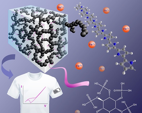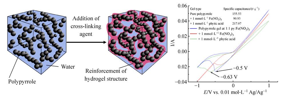 This research looks at ways of tailoring and improving the stiffness of polypyrrole hydrogels for use as flexible supercapacitor electrodes. Molecules providing additional cross-linking between polypyrrole chains are added post-polymerisation but before gelation, and are found to increase gel stiffness by up to 600%, with the degree of change dependent on reactant type and proportion. It was also found that addition of phytic acid led to an increase in pseudocapacitive behaviour of the hydrogel, and thus a maximum specific capacitance of 217.07 F·g−1 could be achieved. This is an increase of 140% compared to pristine polypyrrole hydrogels produced by this method.