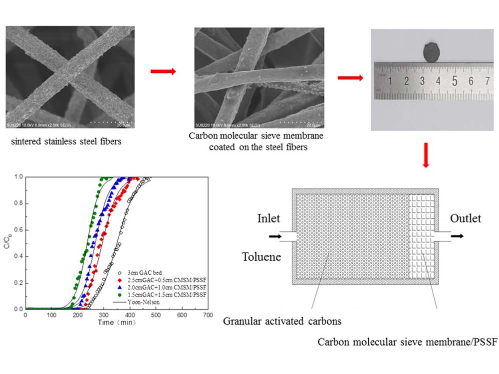 Carbon molecular sieve membrane (CMSM)/paper-like stainless steel fibers (PSSF) has been manufactured by pyrolyzing poly (furfuryl alcohol) (PFA) coated on the metal fibers. PFA was synthesized using oxalic acid dihydrate as a catalyst and coated on microfibers by dip coating method. For the purpose of investigating the effects of final carbonization temperature, the composites were carbonized between 400°C and 800°C under flowing nitrogen. The morphology and microstructure were examined by X-ray diffraction, Fourier transforms infrared spectroscopy, scanning electron microscopy, thermogravimetric analysis, N2 adsorption and desorption, Raman spectra and X-ray photoelectron spectra. The consequences of characterization showed that the CMSM containing mesopores of 3.9 nm were manufactured. The specific surface area of the CMSM/PSSF fabricated in different pyrolysis temperature varies from 26.5 to 169.1 m2∙g−1 and pore volume varies from 0.06 to 0.23 cm3∙g−1. When pyrolysis temperature exceeds 600°C, the specific surface, pore diameter and pore volume decreased as carbonization temperature increased. Besides, the degree of graphitization in carbon matrix increased with rising pyrolysis temperature. Toluene adsorption experiments on different structured fixed bed that was padded by CMSM/PSSF and granular activated carbon (GAC) were conducted. For the sake of comparison, adsorption test was also performed on fixed bed packed with GAC. The experimental results indicated that the rate constant k′ was dramatically increased as the proportion of CMCM/PSSF composites increased on the basis of Yoon-Nelson model, which suggested that structured fixed bed padded with CMSM/PSSF composite offered higher adsorption rate and mass transfer efficiency.