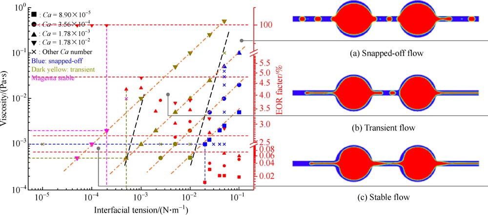 Water/oil flow characteristics in a water-wet capillary were simulated at the pore scale to increase our understanding on immiscible flow and enhanced oil recovery. Volume of fluid method was used to capture the interface between oil and water and a pore-throat connecting structure was established to investigate the effects of viscosity, interfacial tension (IFT) and capillary number ( Ca). The results show that during a water displacement process, an initial continuous oil phase can be snapped off in the water-wet pore due to the capillary effect. By altering the viscosity of the displacing fluid and the IFT between the wetting and non-wetting phases, the snapped-off phenomenon can be eliminated or reduced during the displacement. A stable displacement can be obtained under high Ca number conditions. Different displacement effects can be obtained at the same Ca number due to its significant influence on the flow state, i.e., snapped-off flow, transient flow and stable flow, and ultralow IFT alone would not ensure a very high recovery rate due to the fingering flow occurrence. A flow chart relating flow states and the corresponding oil recovery factor is established.