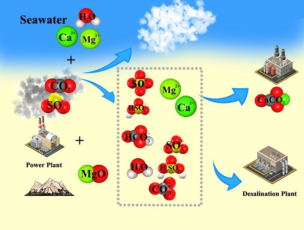 The desulfurization by seawater and mineral carbonation have been paid more and more attention. In this study, the feasibility of magnesia and seawater for the integrated disposal of SO2 and CO2 in the simulated flue gas was investigated. The process was conducted by adding MgO in seawater to reinforce the absorption of SO2 and facilitate the mineralization of CO2 by calcium ions. The influences of various factors, including digestion time of magnesia, reaction temperature, and salinity were also investigated. The results show that the reaction temperature can effectively improve the carbonation reaction. After combing SO2 removal process with mineral carbonation, Ca2+ removal rate has a certain degree of decrease. The best carbonation condition is to use 1.5 times artificial seawater (the concentrations of reagents are 1.5 times of seawater) at 80°C and without digestion of magnesia. The desulfurization rate is close to 100% under any condition investigated, indicating that the seawater has a sufficient desulfurization capacity with adding magnesia. This work has demonstrated that a combination of the absorption of SO2 with the absorption and mineralization of CO2 is feasible.