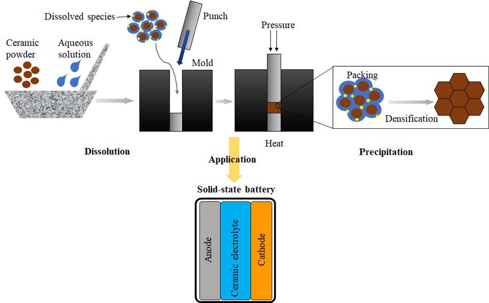 In traditional ceramic processing techniques, high sintering temperature is necessary to achieve fully dense microstructures. But it can cause various problems including warpage, overfiring, element evaporation, and polymorphic transformation. To overcome these drawbacks, a novel processing technique called “cold sintering process (CSP)” has been explored by Randall et al. CSP enables densification of ceramics at ultra-low temperature (≤300°C) with the assistance of transient aqueous solution and applied pressure. In CSP, the processing conditions including aqueous solution, pressure, temperature, and sintering duration play critical roles in the densification and properties of ceramics, which will be reviewed. The review will also include the applications of CSP in solid-state rechargeable batteries. Finally, the perspectives about CSP is proposed.