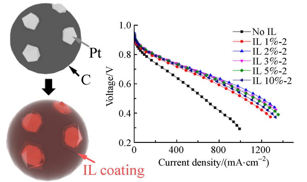 The modification of Pt/C catalyst by using ionic liquids to improve their catalyst activities has been reported by many researchers, but their practical behavior in operating fuel cells is still unknown. In this work, we study the ionic liquid modified Pt/C nanoparticle catalysts within cathodes for proton exchange membrane fuel cells. The influence of the ionic liquid amount, adsorption times and dispersing solvents are investigated. The experiment results show the best performance enhancement is achieved through two-time surface modification with 2 wt-% ionic liquid solution. The mechanisms are explored with the attribution to the high oxygen solubility in the ionic liquid enabling an improved oxygen diffusion in micropores and to good hydrophobicity facilitating water expelling from the active sites in fuel cell operation.