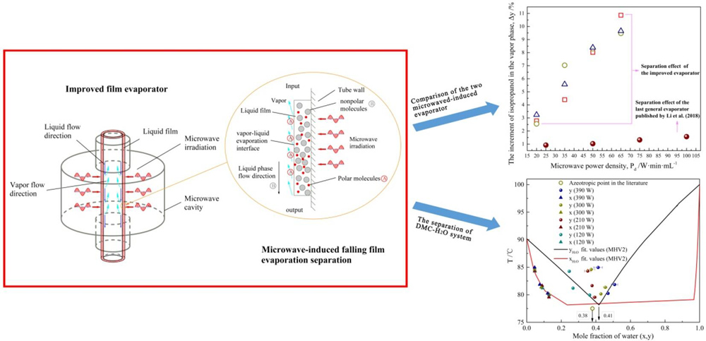 Microwave-induced film evaporation separation process has been reported recently to separate the polar/nonpolar mixture. However, the efficiency of the separation is still too low for practical applications, which requires further enhancement via different strategies such as optimization design of evaporator structure. In addition the depth understanding of the separation mechanisms is great importance for better utilization of the microwave-induced separation process. To carry out these investigations, a novel microwave-induced falling film evaporation instrument was developed in this paper. The improvement of the enhancement effect of microwave-induced separation was observed based on the improved film evaporator. The systematic experiments on microwave-induced separation with different binary azeotropic mixtures (ethanol-ethyl acetate system and dimethyl carbonate (DMC)-H2O system) were conducted based on the new evaporator. For the ethanol-ethyl acetate system, microwave irradiation shifted the direction of evaporation separation at higher ethanol content in the starting liquid mixture. Moreover, for DMC-H2O system microwave-induced separation process broke through the limitations of the traditional distillation process. The results clearly demonstrated the microwave-induced evaporation separation process could be commendably applied to the separation of binary azeotrope with different dielectric properties. Effects of operating parameters are also investigated to trigger further mechanism understanding on the microwave-induced separation process.