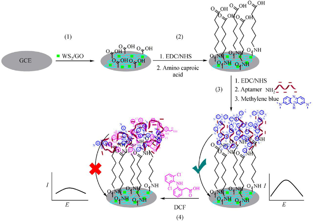 A p-type transition metal dichalcogenide (WS2) was synthesized and hybridized with graphene oxide via a simple hydrothermal method. The as-prepared material was used to modify a glassy carbon electrode for the fabrication of a simple, stable, and repeatable methylene blue-labeled “signal-off” aptasensor used for the sensitive determination of very low amounts of sodium diclofenac (DCF). The synthetic material, modification process, and role of WS2 in the current response enhancement were studied by X-ray diffraction, energy-dispersive X-ray spectroscopy, field emission scanning electron microscopy, high resolution transmission electron microscopy, Hall effect, cyclic voltammetry, differential pulse voltammetry, and electrochemical impedance spectroscopy. Subsequently, a wide linear range of DCF concentration (0.5–300 nmol/L), very low limit of detection (0.23 nmol/L), and good selectivity were obtained using the differential pulse voltammetry method with the assembled aptasensor. Finally, the fabricated aptasensor was successfully developed for physiological real samples with significant recoveries.