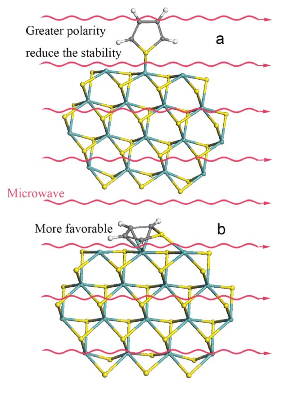 Hydrodesulfurization (HDS) of thiophene, as a gasoline model oil, over an industrial Ni-Mo/Al 2O 3 catalyst was investigated in a continuous system under microwave irradiation. The HDS efficiency was much higher (5%–14%) under microwave irradiation than conventional heating. It was proved that the reaction was enhanced by both microwave thermal and non-thermal effects. Microwave selective heating caused hot spots inside the catalyst, thus improved the reaction rate. From the analysis of the non-thermal effect, the molecular collisions were significantly increased under microwave irradiation. However, instead of being reduced, the apparent activation energy increased. This may be due to the microwave treatment hindering the adsorption though upright S-bind (η 1) and enhancing the parallel adsorption (η 5), both adsorptions were considered to favor to the direct desulfurization route and the hydrogenation route respectively. Therefore, the HDS process was considered to proceed along the hydrogenation route under microwave irradiation.