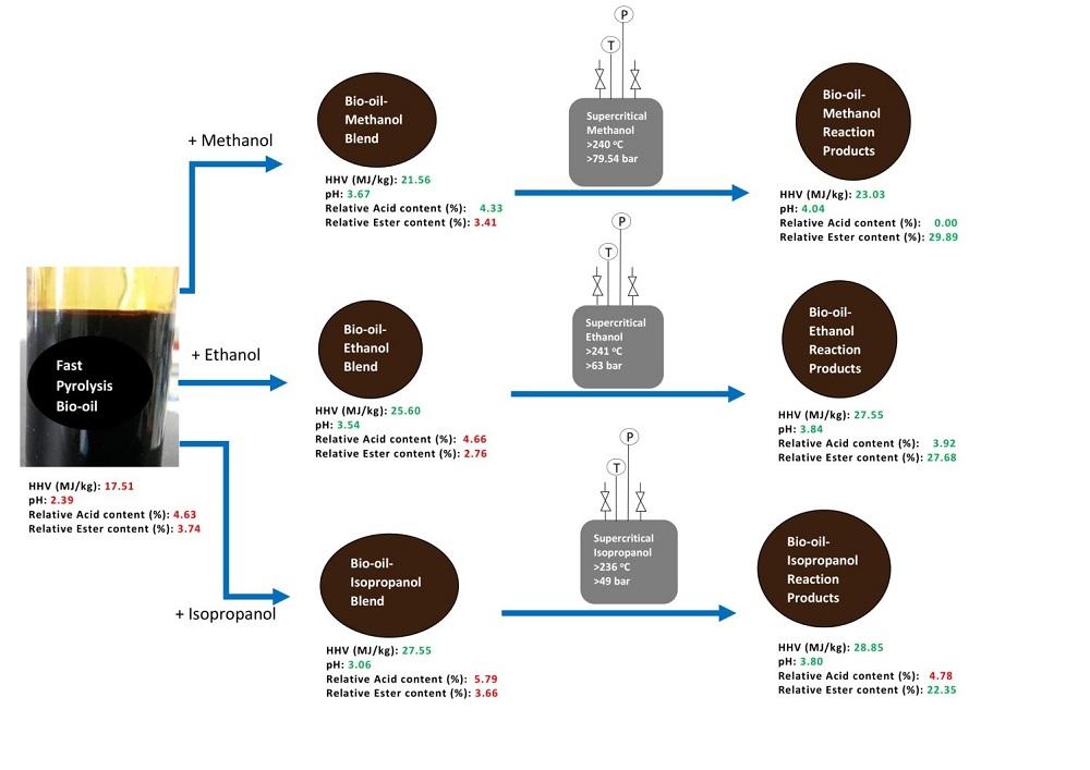 The work studied a non-catalytic upgrading of fast pyrolysis bio-oil by blending under supercritical conditions using methanol, ethanol and isopropanol as solvent and hydrogen donor. Characterisation of the bio-oil and the upgraded bio-oils was carried out including moisture content, elemental content, pH, heating value, gas chromatography-mass spectrometry (GCMS), Fourier transform infrared radiation, 13C nuclear magnetic resonance spectroscopy, and thermogravimetric analysis to evaluate the effects of blending and supercritical reactions. The GCMS analysis indicated that the supercritical methanol reaction removed the acids in the bio-oil consequently the pH increased from 2.39 in the crude bio-oil to 4.04 after the supercritical methanol reaction. The ester contents increased by 87.49% after the supercritical methanol reaction indicating ester formation could be the major deacidification mechanism for reducing the acidity of the bio-oil and improving its pH value. Simply blending crude bio-oil with isopropanol was effective in increasing the C and H content, reducing the O content and increasing the heating value to 27.55 from 17.51 MJ·kg ‒ 1 in the crude bio-oil. After the supercritical isopropanol reaction, the heating value of the liquid product slightly further increased to 28.85 MJ·kg ‒ 1.