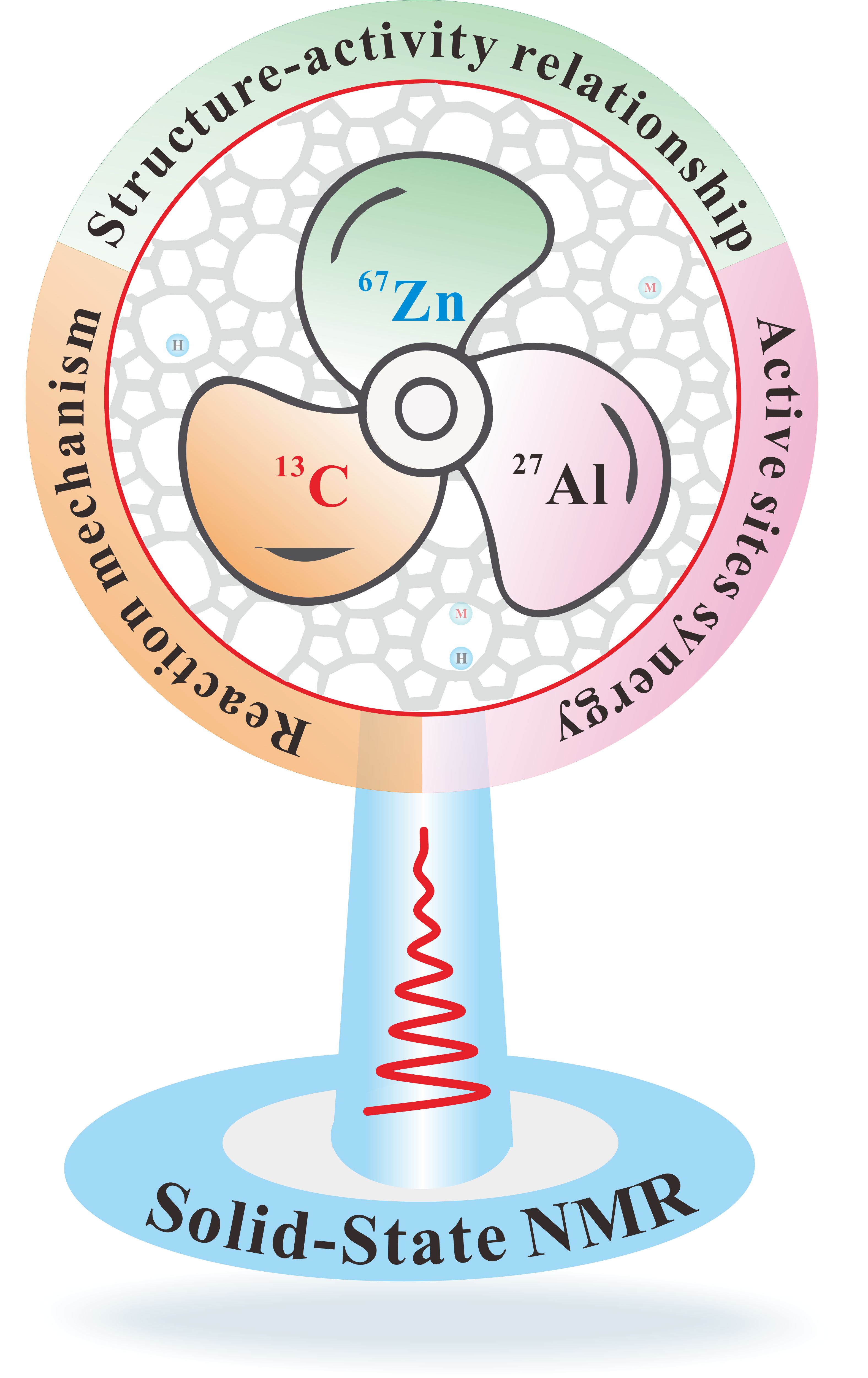 Metal-containing zeolite catalysts have found a wide range of applications in heterogeneous catalysis. To understand the nature of metal active sites and the reaction mechanism over such catalysts is of great importance for the establishment of structure-activity relationship. The advanced solid-state NMR (SSNMR) spectroscopy is robust in the study of zeolites and zeolite-catalyzed reactions. In this review, we summarize recent developments and applications of SSNMR for exploring the structure and property of active sites in metal-containing zeolites. Moreover, detailed information on host-guest interactions in the relevant zeolite catalysis obtained by SSNMR is also discussed. Finally, we highlight the mechanistic understanding of catalytic reactions on metal-containing zeolites based on the observation of key surface species and active intermediates.