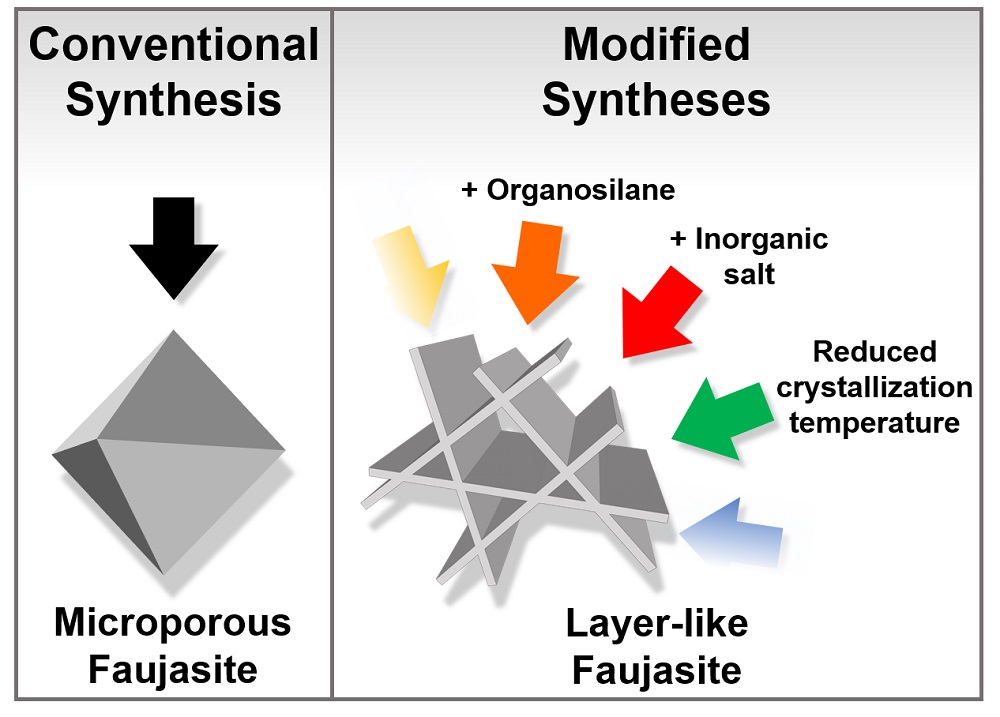 The creation of intergrown layer-like zeolite crystals is one route to form hierarchical zeolites. Faujasite-type (FAU-type) zeolites are among the industrially most important zeolites and the implementation of hierarchical porosity is a promising way to optimise their catalytic and adsorptive performance. After a short general survey into routes for the preparation of hierarchical pore systems in FAU, we will review the currently existing strategies for the synthesis of FAU with layer-like morphology. Those strategies are mainly based on the presence of morphology modifying agents in the synthesis mixture. However, a very recent approach is the synthesis of layer-like FAU-type zeolite crystals assembled in an intergrown manner in the absence of such additives, just by finely adjusting the crystallization temperature. This additive-free preparation route for layer-like FAU, which appears very attractive from an ecological as well as economic point of view, is highlighted in this review. Concluding, a comparison, including powder X-ray diffraction, scanning and transmission electron microscopy, nitrogen physisorption and elemental analysis, between conventional FAU and three layer-like FAU obtained by different synthesis routes was carried out to show the structural, morphological and textural differences and similarities of these materials.