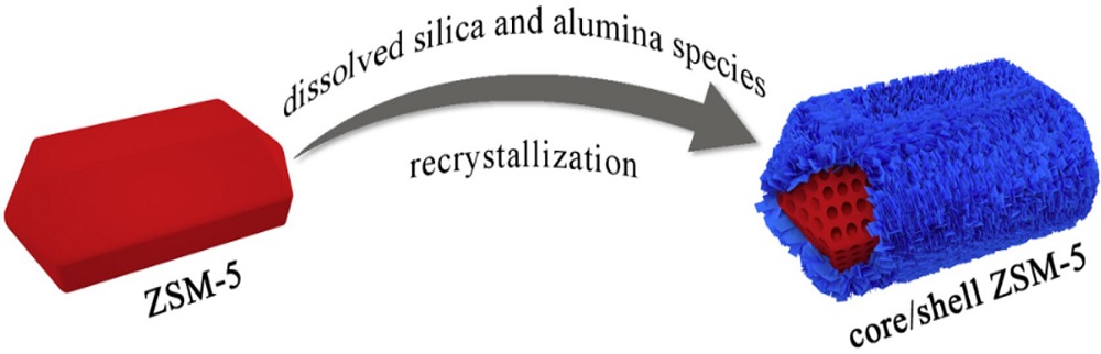 Hierarchical core/shell Zeolite Socony Mobil-five (ZSM-5) zeolite was hydrothermally postsythesized in the solution of NaOH and diammonium surfactant via a dissolution-reassembly strategy. The silica and alumina species were firstly dissolved partially from the bulky ZSM-5 crystals and then were in situ reassembled into the MFI-type nanosheets with the structure-directing effect of diammonium surfactant, attaching to the out-surface of ZSM-5 core crystals. The mesopores thus were generated in both the core and shell part, giving rise to a micropore/mesopore composite material. The micropore volume and the acidity of the resultant hybrid were well-preserved during this in situ recrystallization process. Possessing the multiple mesopores and enlarged external surface area, the core/shell ZSM-5 zeolite exhibited higher activity in the ketalation and acetalization reactions involving bulky molecules in comparison to the pristine ZSM-5.