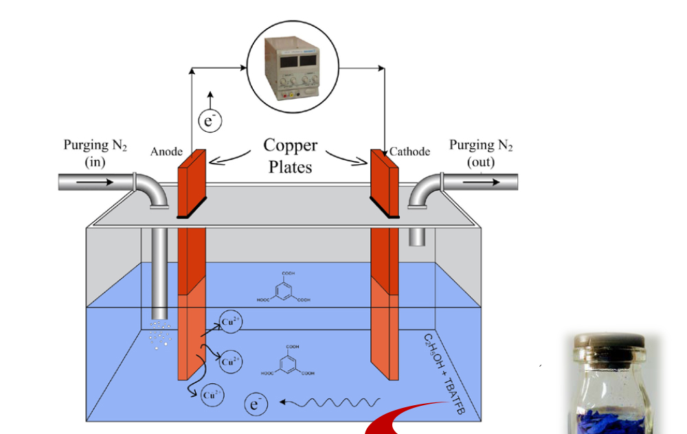 Cu3(BTC)2, a common type of metal organic framework (MOF), was synthesized through electrochemical route for CO2 capture and its separation from N2. Taguchi method was employed for optimization of key parameters affecting the synthesis of Cu3(BTC)2. The results indicated that the optimum synthesis conditions with the highest CO2 selectivity can be obtained using 1 g of ligand, applied voltage of 25 V, synthesis time of 2 h, and electrode length of 3 cm. The single gas sorption capacity of the synthetized microstructure Cu3(BTC)2 for CO2 (at 298 K and 1 bar) was a considerable value of 4.40 mmol·g−1. The isosteric heat of adsorption of both gases was calculated by inserting temperature-dependent form of Langmuir isotherm model in the Clausius-Clapeyron equation. The adsorption of CO2/N2 binary mixture with a concentration ratio of 15/85 vol-% was also studied experimentally and the result was in a good agreement with the predicted value of IAST method. Moreover, Cu3(BTC)2 showed no considerable loss in CO2 adsorption after six sequential cycles. In addition, artificial neural networks (ANNs) were also applied to predict the separation behavior of CO2/N2 mixture by MOFs and the results revealed that ANNs could serve as an appropriate tool to predict the adsorptive selectivity of the binary gas mixture in the absence of experimental data.