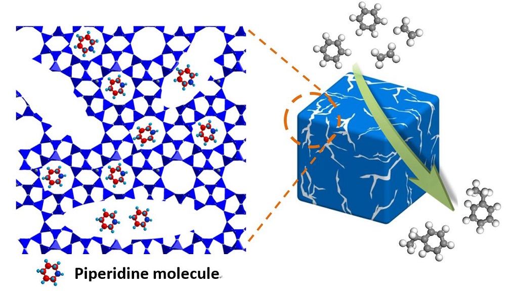 Hierarchical ZSM-5 zeolite with radial mesopores is controllably synthesized using piperidine in a NaOH solution. The piperidine molecules enter the zeolite micropores and protect the zeolite framework from extensive desilication. The areas containing fewer aluminum atoms contain fewer piperidine protectant molecules and so they dissolve first. Small amounts of mesopores are then gradually generated in areas with more aluminum atoms and more piperidine protectant. In this manner, radial mesopores are formed in the ZSM-5 zeolite with a maximal preservation of the micropores and active sites. The optimal hierarchical ZSM-5 zeolite, prepared with a molar ratio of piperidine to zeolite of 0.03, had a mesopore surface area of 136 m2·g−1 and a solid yield of 80%. The incorporation of the radial mesopores results in micropores that are interconnected which shortened the average diffusion path length. Compared to the parent zeolite, the hierarchical ZSM-5 zeolite possesses more accessible acid sites and has a higher catalytic activity and a longer lifetime for the alkylation of benzene.