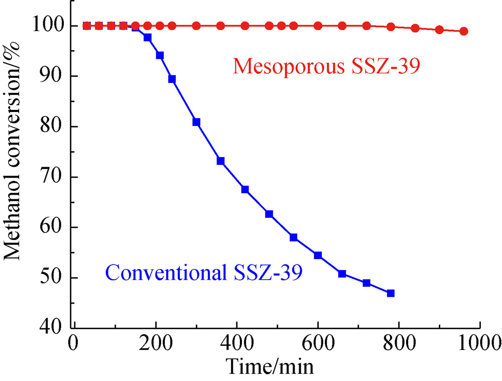 SSZ-39 zeolite with AEI framework structure is a good catalyst candidate for the methanol-to-olefins (MTO) reaction. However, the diffusion limitation and coke formation often results in fast deactivation of the SSZ-39 zeolite catalyst. One solution for this challenge is to introduce mesoporosity in the SSZ-39 zeolite. Herein, we report the synthesis of mesoporous SSZ-39 zeolite using an organosilane surfactant, N,N-dimethyl-N-(3-(trimethoxysilyl)propyl)octan-1-aminium chloride, as a mesopore template and N,N-dimethyl-cis-2,6-dimethylpiperidinium as a micropore template. The obtained zeolites were characterized by X-ray diffraction, N2 sorption, scanning electron microscopy, temperature programmed desorption of ammonia, and magic angle spinning nuclear magnetic resonance of 27Al. The results show that the mesoporous SSZ-39 zeolite has high crystallinity, meso/microporosity, high surface area, cuboid morphology, and abundant acidic sites. More importantly, this mesoporous SSZ-39 zeolite exhibits enhanced catalyst lifetime in the MTO reaction due to the presence of mesoporosity for fast mass transfer, compared with a conventional SSZ-39 zeolite without mesoporosity.