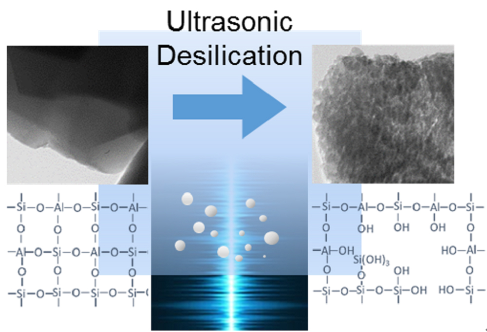 Mesoporous Y zeolites were prepared by the sequential chemical dealumination (using chelating agents such as ethylenediaminetetraacetic acid, H 4EDTA, and citric acid aqueous solutions) and alkaline desilication (using sodium hydroxide, NaOH, aqueous solutions) treatments. Specifically, the ultrasound-assisted alkaline treatment (i.e., ultrasonic treatment) was proposed as the alternative to conventional alkaline treatments which are performed under hydrothermal conditions. In comparison with the hydrothermal alkaline treatment, the ultrasonic treatment showed the comparatively enhanced efficiency (with the reduced treatment time, i.e., 5 min vs. 30 min, all with 0.2 mol·L −1 NaOH at 65°C) in treating the dealuminated Y zeolites for creating mesoporosity. For example, after the treatment of a dealuminated zeolite Y (using 0.1 mol·L −1 H 4EDTA at 100°C for 6 h), the ultrasonic treatment produced the mesoporous zeolite Y with the specific external surface area ( S external) of 160 m 2·g − 1 and mesopore volume ( V meso) of 0.22 cm 3·g − 1, being slightly higher than that by the conventional method (i.e., S external = 128 m 2·g − 1 and V meso = 0.19 cm 3·g − 1). The acidic property and catalytic activity (in catalytic cracking of n-octane) of mesoporous Y zeolites obtained by the two methods were comparable. The ultrasonic desilication treatment was found to be generic, also being effective to treat the dealuminated Y zeolites by citric acid. Additionally, the first step of chemical dealumination treatment was crucial to enable the effective creation of mesopores in the parent Y zeolite (with a silicon-to-aluminium ratio, Si/Al= 2.6) regardless of the subsequent alkaline desilication treatment (i.e., ultrasonic or hydrothermal). Therefore, appropriate selection of the condition of the chemical dealumination treatment based on the property of parent zeolites, such as Si/Al ratio and crystallinity, is important for making mesoporous zeolites effectively.